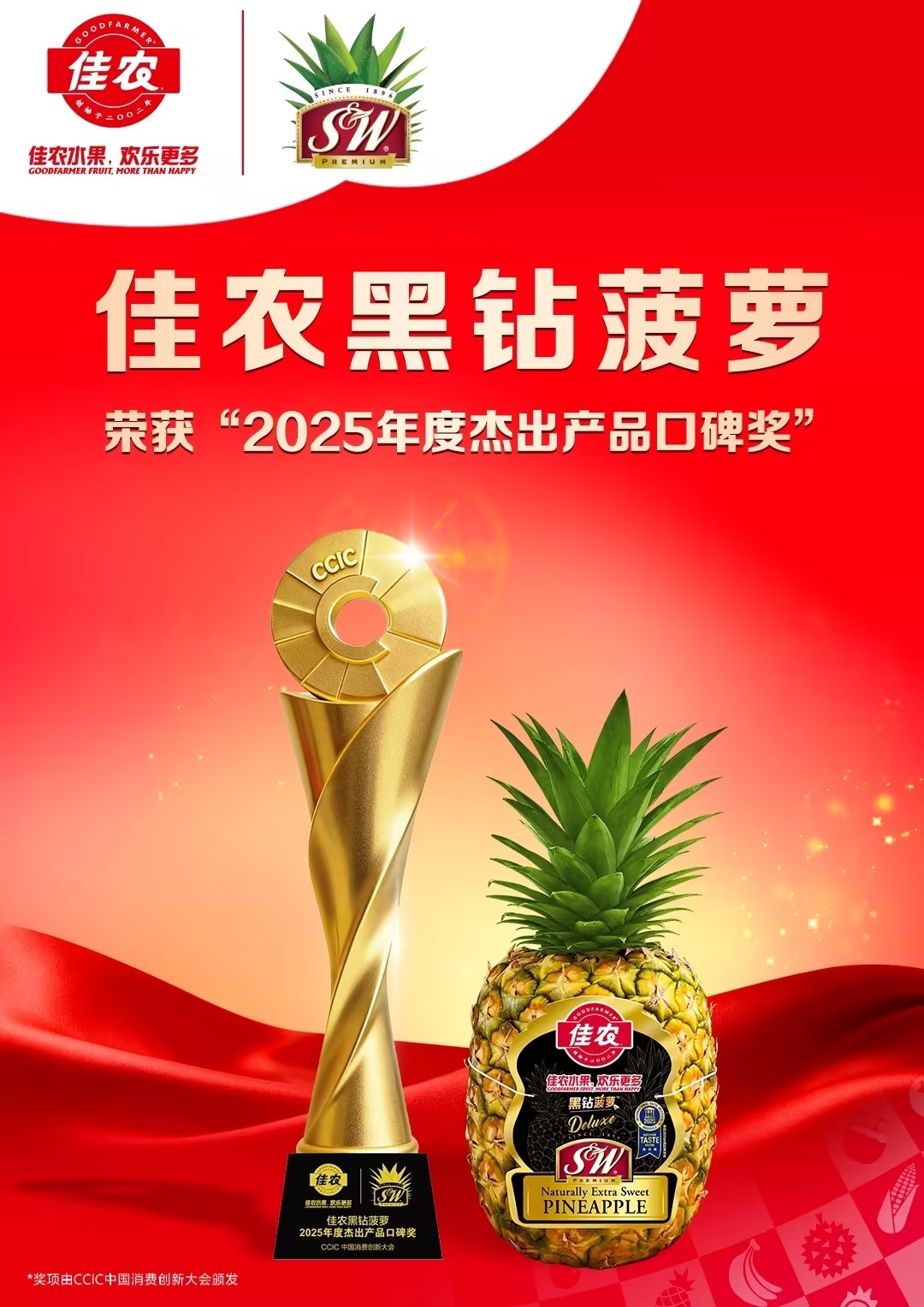 热烈祝贺佳农水果斩获“2025年度行业领军品牌奖” 佳农黑钻菠萝荣获“2025年度杰出产品口碑奖”! 两大荣誉加身,既是行业对佳农水果领军地位的认可,更是更大消费者对其深耕供应链、坚守品质承诺的高度信赖。